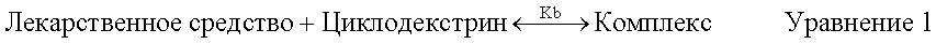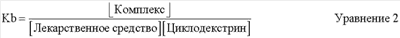 Вышеуказанный динамический и обратимый равновесный процесс может быть описан уравнениями 1 и 2, в которых количество комплекса находится в зависимости от концентраций лекарственного средства и циклодекстрина и константы равновесия или связывания Кb. При введении композиций, содержащих циклодекстрин, путем инъекции в кровоток комплекс быстро распадается вследствие растворения и неспецифического связывания лекарственного средства с компонентами крови и тканей.