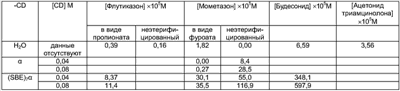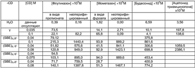 В данной области известно о необходимости выполнения структурной оценки родственных вариантов производного циклодекстрина определенного типа для оптимизации связывания конкретного соединения с производным циклодекстрина данного типа. Однако существенные различия в связывании определенного соединения с первым вариантом производного декстрина по сравнению с его вторым вариантом часто отсутствуют. Например, очень редко встречаются существенные различия в связывании определенного лечебного средства с первым производным циклодекстрина и структурно родственным вторым производным циклодекстрина. Когда такие ситуации возникают, они оказываются неожиданными. Ворт и др. (Worth et al., 24th International Symposium on Controlled Release of Bioactive Materials (1997)) представили результаты исследования по оценке пригодности комплексов стероид/циклодекстрин для доставки лекарственного средства в легкие. Было произведено сравнение -CD, SBE- -CD и НР- -CD в отношении их способности образовывать комплексы включения с дипропионатом беклометазона (BDP) и его активным метаболитом монопропионатом беклометазона (ВМР). ВМР легче растворялся циклодекстрином, при этом был выявлен нижеследующий порядок растворяющей способности: НР- -CD (самая высокая) > -CD > SBE7- -CD. Таким образом, следует ожидать, что производные SAE-CD окажутся непригодными для растворения кортикостероидов, таких как ВМР или BDP. Хотя не были приведены результаты, касающиеся действительной пригодности применения в ингаляционных композициях, авторы статьи предположили, что ВМР будет лучшей альтернативой BDP для создания распыляемого раствора.