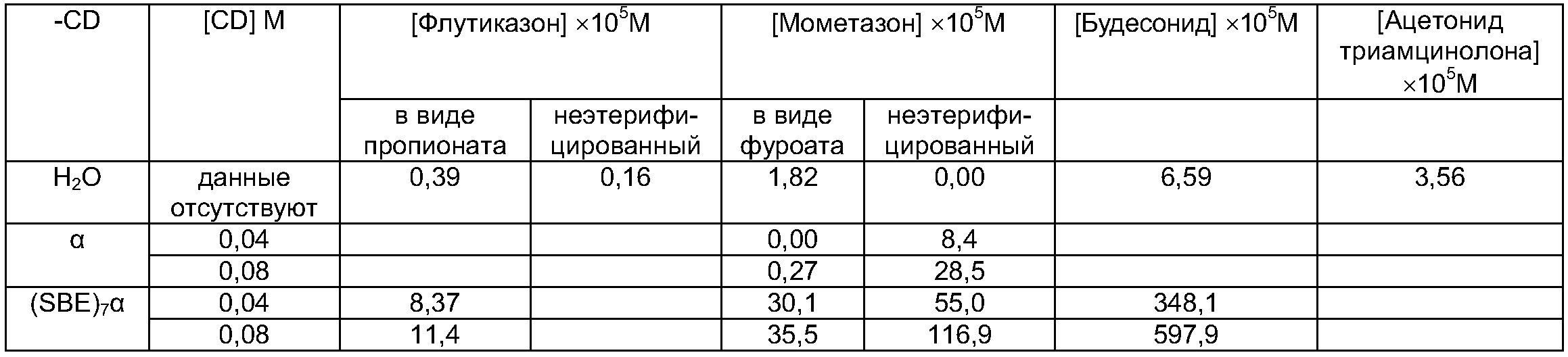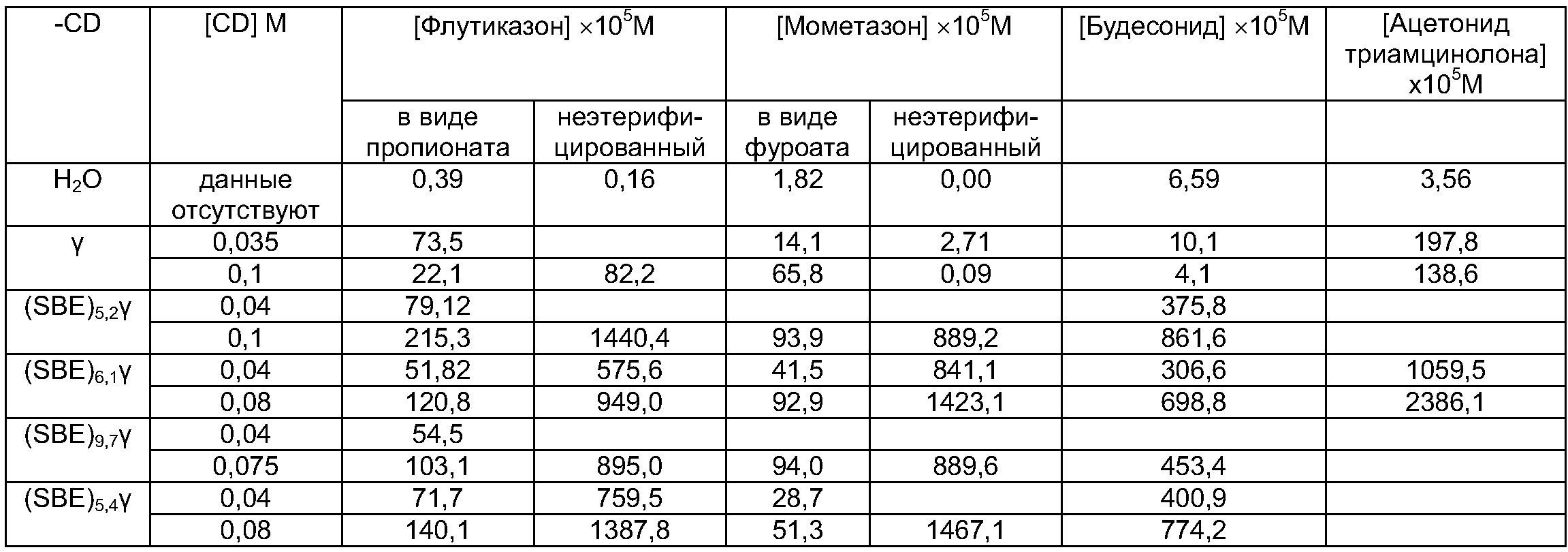 Производное бета-циклодекстрина, образованное сульфобутиловым эфиром (SBE- -CD), в частности, производное, имеющее в среднем примерно 7 заместителей в молекуле циклодекстрина (SBE7- -CD), создано на коммерческой основе компанией CyDex, Inc. под товарным знаком CAPTISOL®. Сульфобутиловый эфир, являющийся анионным заместителем, существенно улучшает растворимость в воде исходного циклодекстрина. Кроме того, присутствие зарядов уменьшает способность молекулы образовывать комплекс с холестерином по сравнению с гидроксипропильным производным. Образование обратимого нековалентного комплекса лекарственных средств с циклодекстрином CAPTISOL® обычно способствует лучшей растворимости и устойчивости лекарственных средств в водных растворах. Хотя CAPTISOL® является относительно новым, но известным циклодекстрином, ранее не было исследована возможность его применения при получении кортикостероид-содержащих распыляемых растворов.