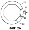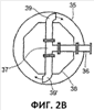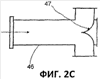 На фиг.2 в трех сечениях “А”, “B” и “С” показаны три формы исполнения радиальных устройств подвода. Показанные в разрезе изображения “А” и “B” представляют поперечные сечения, выполненные на уровне разреза А-А регенерационной колонны той модели, которая представлена на фиг.1. Цилиндрическая оболочка (25, 35) регенерационной колонны имеет радиальное устройство подвода (26, 36), которое в случае формы исполнения, представленной на фигуре 2А, непосредственно переходит в прилегающий к внутренней стенке колонны дефлектор (27), в котором происходит деление поступающего потока и его резкое отклонение на 90 град. Затем в галерее (28) происходит разделение обоих выходящих из дефлектора (27) встречных потоков. Резкое изменение направления входящего в дефлектор (27) потока при одновременном снятии давления приводит к сильным вихревым движениям, ударам и толчкам, которые оказывают влияние на всю головную часть колонны и на ее встроенные узлы, так что со временем неизбежно возникновение повреждений. Аналогичной является ситуация и в случае формы исполнения, представленной на фиг.2B. Радиальное устройство (36) подвода, проведенное через стенку (35) колонны, соединено с размещенным в аксиальном центре колонны Т-образным элементом (37), концы (39, 39′) которого в пространстве между галереей (38) и цилиндрическим корпусом (35) колонны согнуты в Т-образной плоскости под углом 90 град. В этом случае поступающий поток резко меняет направление соответственно на 90 град, даже дважды, что, как было уже описано выше, может стать причиной возникновения значительных вихревых движений, ударов и толчков в головной части колонны. И в этом случае со временем неизбежно возникновения повреждений. Имеющие форму клина разделители потока, представленные на фиг.2С, едва ли могут помочь в этой ситуации. Выполненный клинообразно разделитель (47) потока имеет в силу обстоятельств довольно близкие радиусы, так что отклонение на 90 град происходит очень резко. Устройство подвода с мгновенным выделением выпускает на этой стадии сброса давления много газа. Чередование сжимаемой среды (газ) и несжимаемой среды (жидкость) является в этом случае причиной возникновения в поступающем потоке уже упоминавшихся выше толчков и ударов, а также повреждений, появление которых со временем неизбежно.