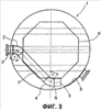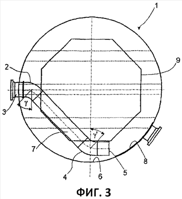 На фиг.3 схематично показано поперечное сечение регенерационной колонны на уровне ввода нагруженного газом потока жидкости. Обозначенная цифрой 1 цилиндрическая оболочка головной части регенерационной колонны снабжена радиальной подводящей линией 3, которая после входа в колонну сразу же переходит в первое колено 2 трубы. На месте входа подводящей линии 3 в колонну можно предусмотреть фланец, с помощью которого состоящая из колен трубы конструкция, выполненная согласно изобретению, крепится на подводящей линии 3. Изображенное на фиг.3 колено 2 трубы имеет угол изгиба , равный 45°, и соединено с прямым патрубком 7, который переходит во второе колено 4 трубы, изогнутое в противоположном направлении. Это второе колено трубы также имеет угол кривизны ( ), равный 45°. Длина прямого патрубка 7 в варианте, показанном на фиг.3, выбрана таким образом, что второе колено трубы смещено относительно впускного патрубка 3 приблизительно на 90° по дуге, которую описывает внутренний периметр колонны. Его выпускное отверстие 5 находится в непосредственной близости от внутренней стенки 6 колонны, так что при вводе нагруженного газом потока жидкости этот поток почти тангенциально касается внутренней стенки 6 колонны 1 в том месте, где она имеет утолщение 8. Входящий поток жидкости разделяется в головной части колонны внутри галереи 9 и на этой галерее, которая имеет общепринятое конструктивное исполнение. Выполненная согласно изобретению трубная конструкция, которая преобразует характеристику поступающего потока из радиальной в тангенциальную, имеет форму лежащего вытянутого вопросительного знака или же вытянутой буквы S.