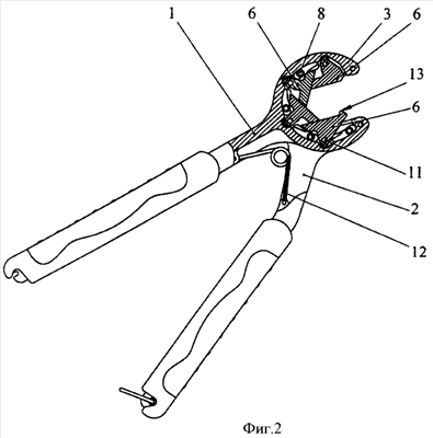 Рукояти 1 и 2 соединены между собой также при помощи пружины 12. Концы (усы) пружины закреплены соответственно на рукоятях 1 и 2, раздвигая их друг от друга. Эта пружина может представлять собой одновитковую спираль, но может быть любой, например многовитковой, радиальной, пластинчатой, пружиной растяжения.