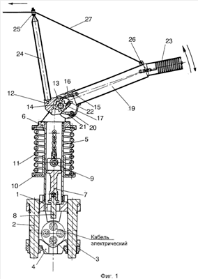 Работа устройства при проколе электрического кабеля осуществляется следующим образом. В целях безопасности устройство приводится в действие с определенного расстояния при помощи (например) шнура 27. При перемещении шнура 27 в отверстии 25 ручки 24 рукоятка 19 начинает поворачиваться на оси 13, при этом выводит из зацепления со звездочкой 14 подающую собачку 21, которая, воздействуя своей тыльной стороной на выступ 22 фиксирующей собачки 17 и поворачивая ее на оси 16, выводит рабочий зуб 18 из зацепления со звездочкой 14, одновременно препятствует рабочему концу подающей собачки 21 войти в зацепление со звездочкой 14, таким образом звездочка 14 полностью расфиксируется, и цепь 15 имеет возможность свободно перемещаться в любую сторону. Подвижный упор 10, больше не удерживаемый цепью 15, под действием пружины 11 начинает перемещаться, и вместе с ним начинают перемещаться палец 9, цепь 15, шток 7 и пробойник 8. Пробойник 8, внедряясь в электрический кабель, производит его прокол.
