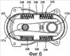В шестом примере варианта реализации, как показано на фиг.1 и 7, динамический амортизатор 253 вибрации размещается в пространстве, существующем внутри корпуса 103, или более конкретно в пространстве, существующем в верхней части корпуса 105 двигателя. Поэтому шестой вариант реализации можно назвать модификацией второго варианта реализации. В шестом варианте реализации, как показано пунктиром на фиг.1, динамический амортизатор 243 вибрации располагают путем использования пространства 251 между верхним концом ротора 111b приводного двигателя 111 и нижней стороной нижнего корпуса 109b внутреннего корпуса 109. Для этого, как показано на фиг.7, телу 255 динамического амортизатора 253 вибрации придают в общем овальную (эллиптическую) форму в разрезе в плане, а грузу 257 придают в общем эллиптическую кольцевидную форму в плане. Груз 257 располагается в скользящем контакте с приемными устройствами 131а и 133а для подшипников таким образом, чтобы сжимать их с обеих сторон, и может перемещаться в продольном направлении (в осевом направлении относительно цилиндра 141). Приемное устройство 131а вмещает подшипник 131, поддерживающий во вращении выходной вал 111а приводного двигателя 111, и приемное устройство 133а принимает подшипник, поддерживающий во вращении вал-шестерню 117а механизма 117 преобразования движения. Приемные устройства 131а и 133а для подшипников используются также как элемент для направления перемещения груза 257 в продольном направлении. Далее, на правой и левой сторонах груза 257 выполнены выступы, а отжимающие пружины 259 располагаются на противоположных сторонах выступов 258. А именно, отжимающие пружины 259 соединяют груз 257 с корпусом амортизатора 253 вибрации. Когда груз 257 перемещается в продольном направлении относительно тела амортизатора 253 вибрации (в осевом направлении относительно цилиндра 141), отжимающие пружины 259 прилагают усилие пружины к грузу 257 в противоположных направлениях.