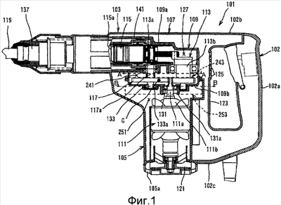 Корпус 107 кривошипа располагается на верхней части рукояти 102 по направлению вперед и соединяется встык с корпусом 107 двигателя сверху. Корпус 107 кривошипа вмещает в себя внутренний корпус 109 вместе с корпусом 105 электродвигателя. Внутренний корпус 109 вмещает цилиндр 141, механизм 113 преобразования движения и шестеренный механизм 114 передачи энергии. Цилиндр 141 содержит ударный элемент 115, привод которого осуществляется для приложения к молотковому сверлу ударного усилия в продольном направлении. Механизм 113 преобразования движения содержит кривошипный механизм и преобразует вращательное движение на выходе приводного двигателя 111 в линейное движение с последующим приводом ударного элемента 115 посредством пневматической пружины. Механизм 117 передачи энергии передает вращательное движение на выходе приводного двигателя 111 как вращение на молотковое сверло 119 через держатель 137 инструмента. Кроме того, внутренний корпус 109 включает в себя верхний корпус 109а и нижний корпус 109b. Верхний корпус 109а вмещает в себя весь цилиндр и большую часть механизма 113 преобразования движения и механизма 117 передачи энергии, в то время как нижний корпус 109b вмещает в себя остальную часть механизма 113 преобразования движения и механизма 117 передачи энергии. Механизм 113 преобразования движения, ударный элемент 115 и механизм 117 передачи энергии являются элементами, которые соответствуют согласно настоящему изобретению «внутреннему механизму».
