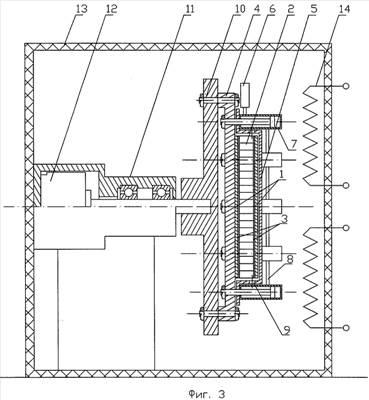 Конструктивно устройство состоит из трехслойной панели с сотовым заполнителем, состоящей из внешних обшивок 1, сотового заполнителя 2 и пленочного клея 3, уложенного между сотовым заполнителем и внешними обшивками (фиг.2), технологической плиты 4, крышки 5, оснащенной съемными поршневыми пневматическими цилиндрами 7, полости высокого давления которых объединены магистралью 8 с запираемым заправочным штуцером 6, для удаления летучих фракций клея в крышке 5 предусмотрены дренажные отверстия 9. Сборка (в соответствии с фиг.2) трехслойной панели с сотовым заполнителем, установленная на технологическую плиту и зафиксированная на ней с помощью крышки, устанавливается на планшайбе 10 (фиг.3) располагаемого в печи (автоклаве) 13 поворотного устройства 11, обеспечивающего вращение сборки из технологической плиты с зафиксированной на ней с помощью крышки трехслойной панелью с сотовым заполнителем в вертикальном положении относительно оси, перпендикулярной силе тяжести. Поворотное устройство управляется приводом 12. Для обеспечения регулирования тепловых режимов и выравнивания распределяемых тепловых потоков предусмотрены управляемые нагреватели печи 14. Кроме этого, выравнивание распределяемых тепловых потоков в печи может осуществляться, например, средствами принудительной циркуляции среды в печи (не показаны).