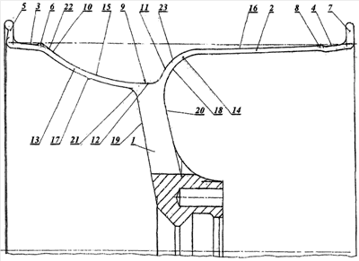 Участок 11 оболочки 14 снаружи ограничен тороидальной поверхностью 23, обращенной вогнутостью к оси колеса. Поверхность 22 касательна с одной стороны наружной поверхности хампа 6, а с другой стороны – наружной поверхности дисковой части 1 в зоне 12, где диаметральные размеры части 1 максимальны.