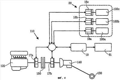 Хотя предпочтительной является трансмиссия 110, включающая две электрические машины, можно использовать только одну электрическую машину, предпочтительно расположенную между узлом привода и ведущими колесами и до коробки передач, т.е. между узлом привода и коробкой передач таким же образом, как расположена вторая электрическая машина 17b, показанная на фиг.4. Также может использоваться по одной упомянутой электрической машине на каждое ведущее колесо. В таком случае обычно используют четыре электрические машины, чтобы приводить в действие четыре ведущих колеса. При этом каждая электрическая машина предпочтительно соединена с соответствующим ведущим колесом посредством соответствующей коробки передач.