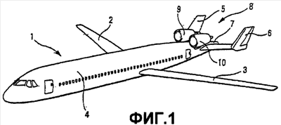 Показываемое схематически на Фиг.1 и 2 воздушное судно согласно изобретению имеет два крыла 2 и 3, расположенные латерально и симметрично по отношению к фюзеляжу 4 с продольной осью L-L.