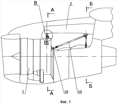 Для передачи силы тяги двигателя 1 на пилон 2 летательного аппарата предусмотрена также наклонная штанга 15, размещенная в рассматриваемом случае под пилоном 2 летательного аппарата (Фиг.1).