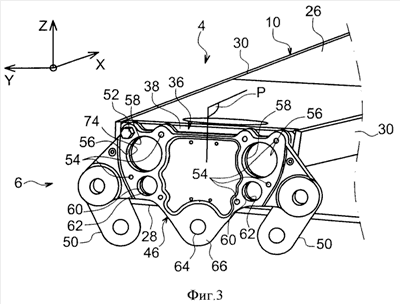 Как показано на фиг.3, на котором более подробно изображена передняя часть опоры 4 двигателя и на котором вертикальная центральная плоскость Р, параллельная направлению X, образует плоскость симметрии этой опоры двигателя, переднее крепление 6 двигателя, следовательно, содержит основную часть 46 крепления, которая имеет вид крепежной скобы, расположенной поперек, вдоль плоскости YZ, закреплена на жесткой конструкции 10 и расположена у передней поверхности 38 закрывающего ребра 36.