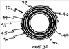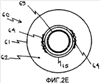 На фиг.3A-3F можно увидеть еще одну конструктивную особенность внутреннего храпового элемента 40. Она заключается в том, что два ряда храповых зубьев выполнены на пояске 48, который присоединен к остальной части внутреннего храпового элемента с помощью узких планок 49. Два ряда зубьев плотно прилегают к соответствующим зубьям 33 на внутренней поверхности внешнего храпового элемента 30. Однако поясок 48 имеет немного меньшую окружность, чем окружность канала внешнего храпового элемента. Это придает пояску 48 некоторую гибкость, о чем будет сказано ниже. Планки 49 разнесены по окружности внутреннего храпового элемента 40, и в результате между ними образуются «окошки» 49A. Такая конструкция обеспечивает еще большую гибкость пояску 48 и позволяет ему изменять свою круглую форму, когда укупорочная пробка открывается в первый раз. Это позволяет храповым зубьям 46, 33 скользить друг по другу, как это описано выше. Эта гибкость является необходимой, поскольку эти два ряда храповых зубьев 46 и 33 устроены так, что они очень плотно прилегают друг к другу. Такое плотное соприкосновение является гарантией того, что внешний храповой элемент 30 не может быть повернутым относительно внутреннего храпового элемента 40 в запирающем направлении, поскольку это относительное вращение ликвидировало бы промежуток «G» и, следовательно, устранило бы свидетельство того, что укупорочное средство уже открывали.