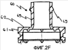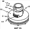 На фиг.2А-2F показана более подробно выливная часть 60. Эта выливная часть 60 включает элемент основания 61, который имеет по существу цилиндрическую форму, и его диаметр приблизительно равен внешнему диаметру горлышка соответствующего контейнера, на котором это укупорочное средство может быть установлено. Элемент основания 61 имеет верхнюю поверхность 62. На этой верхней поверхности 62 находится цилиндр 63, который имеет меньший диаметр и винтовую резьбу 65. Комбинированная часть, состоящая из элемента основания 61 и цилиндра 63 меньшего диаметра, имеет канал, проходящий через эту часть, чтобы содержимое контейнера можно было вылить, когда укупорочное средство открыто. На внешней стенке меньшего цилиндра 63 расположены два ряда храповых зубьев 64.
