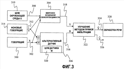 Сигнал 316 альтернативного датчика (B) и сигнал 318 микрофона воздушной звукопроводимости (Y) поступают на блок 322 оценки чистого сигнала, который оценивает чистый сигнал 324 и в некоторых вариантах осуществления оценивает фоновый речевой сигнал 326. Оценка 324 чистого сигнала поступает на блок 328 обработки речи. Оценка 324 чистого сигнала может представлять собой либо сигнал, отфильтрованный во временной области, либо вектор преобразования Фурье. Если оценка 324 чистого сигнала является сигналом во временной области, то блок 328 обработки речи может представлять собой слушающего, систему кодирования речи или систему распознавания речи. Если оценка 324 чистого сигнала является вектором преобразования Фурье, то блок 328 обработки речи обычно является системой распознавания речи или содержит обратное преобразование Фурье для преобразования вектора преобразования Фурье в формы волны.
