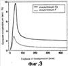 Фиг.3 представляет собой график, на котором средние концентрации Dy и F в телах магнитов М1 и Р1 представлены в виде функции глубины от поверхности магнита.