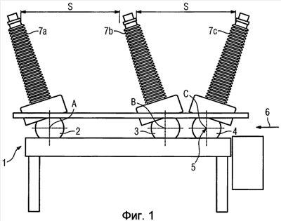Для подведения электрических линий к находящимся внутри герметизирующих корпусов 2, 3, 4 размыкающим блокам на герметизирующих корпусах 2, 3, 4 на стороне оболочки соответственно расположены первый и второй проходной изолятор наружной установки 7а, b, с, d. Главные оси фаз А, В, С расположены в одной общей плоскости и ориентированы параллельно друг к другу. Все расстояния главных осей фаз А, В, С являются различными друг от друга. Так, расстояние между главными осями фаз А и С больше, чем расстояние между главными осями фаз А и В, а также больше, чем расстояние между главными осями фаз В и С. Причем расстояние между главными осями фаз А и В, в свою очередь, больше, чем расстояние между главными осями фаз В и С.