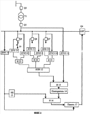 Схема (см. фиг.1) содержит питающий трансформатор Т1, вводной выключатель Q2 на стороне высокого напряжения, вводной выключатель Q3 на стороне низкого напряжения, выключатель АВР Q4, выключатель в отходящей линии Q5, выключатель в отходящей линии Q6, выключатель в отходящей линии Q7, датчик тока короткого замыкания ДТКЗ 8, датчик тока короткого замыкания ДТКЗ 9, датчик тока короткого замыкания ДТКЗ 10, датчик тока короткого замыкания ДТКЗ 11, датчик положения выключателя ДПВ 20, датчик положения выключателя ДПВ 21, датчик положения выключателя ДПВ 22, элемент ИЛИ 12, элемент И 13, элемент И 23, элемент И 24, элемент И 25, элемент ПОВТОРИТЕЛЬ 14, элемент НЕ 15, элемент И 16, элемент ПАМЯТЬ 17, датчик наличия напряжения ДНН 18, точка короткого замыкания 19.