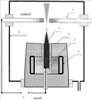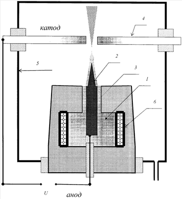 Ионный источник состоит из резервуара с жидкостью, образующей ионы, – 1; пластины из металла, смачиваемого жидкостью резервуара в форме лезвия, – 2; прилегающего к лезвию капилляра – 3; расположенного над пластиной вытягивающего электрода с отверстием для формирования ионного пучка – 4. Источник помещен в вакуумную камеру – 5. Регулирование температуры жидкости осуществляется применением индукционного нагрева для расплавов или криогенной системы для работы сжиженными газами – 6. Между пластиной и вытягивающим электродом создается разность потенциалов U ~ 100 кВ.