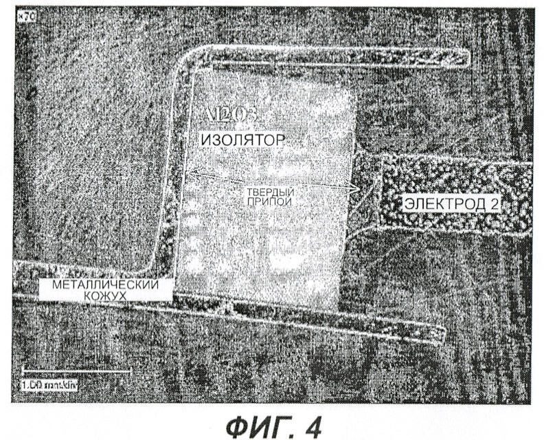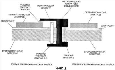 На фиг.2 и 3 представлены дополнительные иллюстрации примеров осуществления настоящего изобретения, описанного в целом со ссылками на фиг.1, включающие многие из его общих особенностей, описанных выше. На фиг.2 первый электрод (второй электрохимической ячейки) структурно и электрически соединен с металлическим кожухом узла соединения твердым припоем 1, а газонепроницаемое уплотнение между электродами 1 и 2 создается парой участков твердого припоев (участков твердого припоя 2 и 3) с обеих сторон изолирующего элемента.