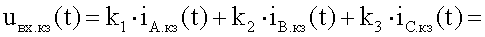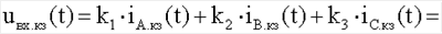 при этом в общем случае значения постоянных коэффициентов k1, k2 и k3 в выражениях (4) могут быть различные, но в конечном итоге такими, чтобы при любом виде КЗ обеспечивалось присутствие во входном сигнале uвх.кз(t), апериодической составляющей u .ап.кз(t), несущей информацию о возникновении переходного процесса при КЗ, в частности это имеет место, например, при равенстве всех трех коэффициентов по модулю, но среди которых, по крайней мере, один положителен, например k1=k, а два других могут быть или отрицательными, например k2=k3=-k, или один из этих двух положительный, а другой отрицательный.