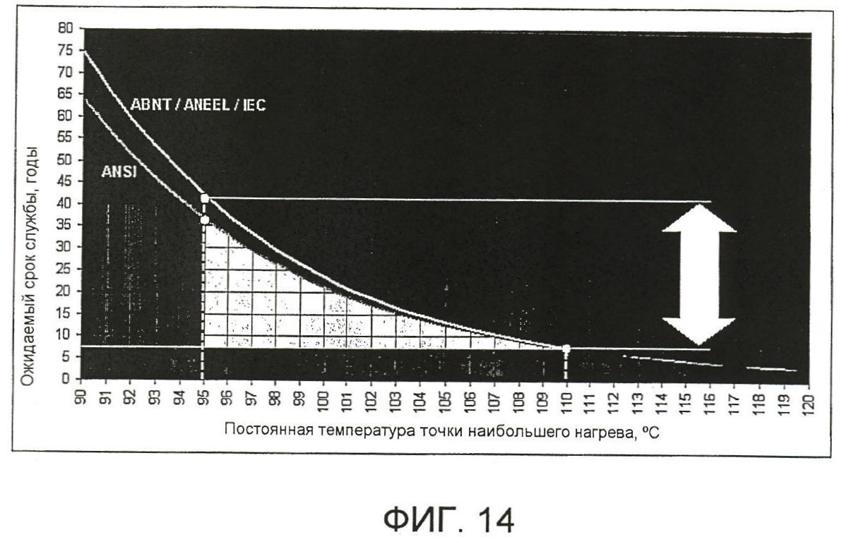 на Фиг.14 приведен график кривых технического стандарта (в данном случае, ABNT – Бразильская ассоциация технических норм и стандартов), с помощью которых сопоставлен ожидаемый срок службы (в годах) трансформатора при постоянной температуре в точке наибольшего нагрева (в °C).