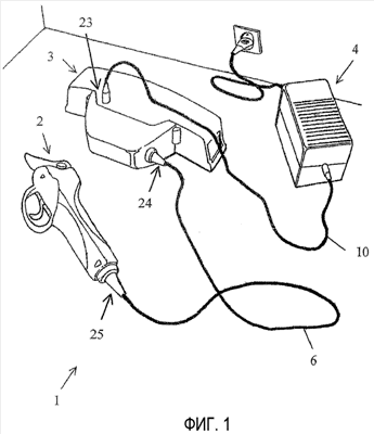 Два последних варианта выполнения включены в третий узел 4 зарядки, который преобразует энергию переменного электрического тока сети в постоянные напряжение и ток, пульсирующие или выпрямленные, предназначенные для зарядки литий-ионной или литий-полимерной батареи, когда третий узел 4 зарядки электрически соединен при помощи гибкого шнура со вторым узлом 3. Третий узел 4 зарядки соединен при помощи съемного гибкого шнура 10 со вторым узлом 3, например, через соединитель 23.
