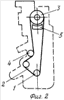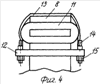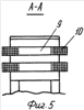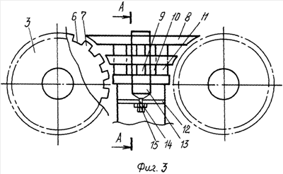Генератор является частью распределительного механизма, в состав которого входят ротор, выполненный в виде зубчатого шкива коленвала 1, зубчатый ремень 2, шкивы распределительного вала 3, натяжной ролик 4. Основная часть электрогенератора – статор установлен или в верхней части головки блока – фиг.1, или в ее нижней части – фиг.2. При таком расположении статора электрогенератора его ротор выполняется в виде зубчатого шкива привода клапанного механизма. Особенностью ротора, выполненного в виде зубчатого шкива 3 является наличие пазов 6 и зубцов 7, которые входят в магнитный контакт через воздушный зазор с магнитопроводами 8 генератора 5, эти магнитопроводы имеют соединение с вертикальными магнитопроводами 9 с катушками возбуждения 10, а на магнитопроводы 8, в частности, на средний, показанный на фиг.3, 4, надеты рабочие катушки 11. Генератор 5 закреплен на полке 12 с помощью немагнитной ленты 13, к концам которой приварены резьбовые стержни 14, на которые навернуты гайки 15.