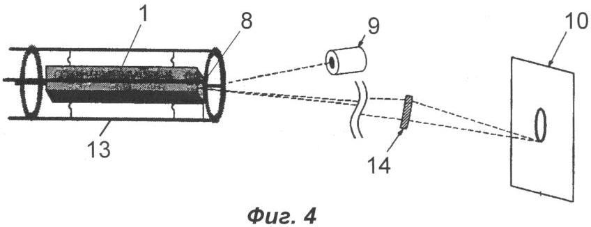– фиг.4 поясняет принцип оптоэлектронного преобразования кругового вращения конца бруска из кристалла кварца в соответствующий электрический сигнал;