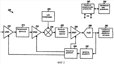 Детектор 232 уровня мощности и регулятор 234 усиления управляют коэффициентами усиления различных усиливающих схемных блоков в приемнике 200. Эти различные усиливающие схемные блоки могут включать в себя LNA 212, VGA 216 и усилитель 224, как показано на Фиг.2. Коэффициенты усиления различных и/или других схемных блоков (например, частотного преобразователя 218) также могут управляться.