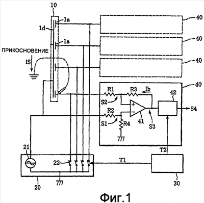 R3=R4, потенциалы заднего и поверхностного электродов 1d и 1a также в итоге выравниваются. Следовательно, электрический ток не течет между задним и поверхностным электродами 1d и 1a вне зависимости от значения электростатической емкости или импеданса, присутствующей(го) между электродами 1d и 1a, и, таким образом, значение электростатической емкости или импеданса никак не влияет на величину выходного сигнала S3, которая изменяется, когда оператор касается поверхностного электрода 1a. Таким образом, значение электростатической емкости или импеданса не влияет на чувствительность детектора для обнаружения прикосновения оператора, и, кроме того, можно исключить взаимное влияние соседних поверхностных электродов 1a тела переключателя 10, вносящих вклад в электростатическую емкость или импеданс.