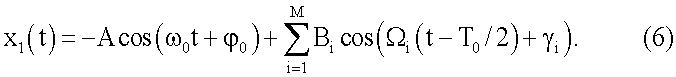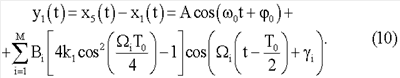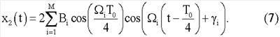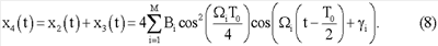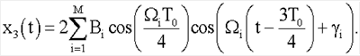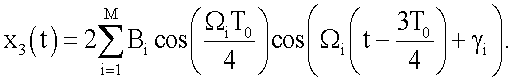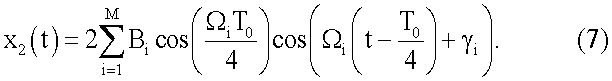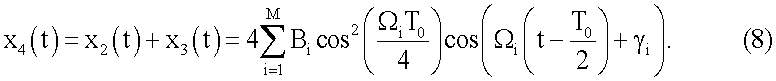 Далее этот сигнал x3(t) поступает на первый вход сумматора 4, где происходит его суммирование с сигналом x2(t) (7), поступающим с выхода 7 первого сумматора на второй вход сумматора 4. В результате сигнал на выходе второго сумматора 4 примет вид