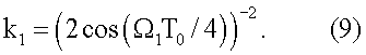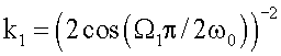Отметим, что при таком выборе коэффициента k1 на выходе первого звена заявленного устройства будет скомпенсирована помеховая составляющая (2) на частоте 1. Остальные частотные составляющие помехи будут скомпенсированы лишь частично. Действительно, сигнал на выходе блока 5, очевидно, принимает вид x5(t)=k1x4(t). Далее этот сигнал поступает на второй вход вычитателя 6, причем на первый вход вычитателя поступает сигнал с выхода первого блока задержки 1 (6). В результате выходной сигнал первого звена заявленного устройства примет вид