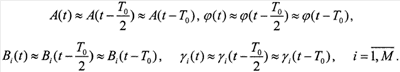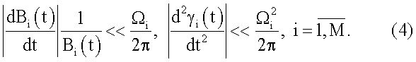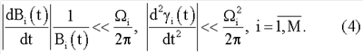 при условии сохранения их узкополосности. В этом случае функции A(t), (t), Bi(t) и i(t) должны являться медленными функциями времени, так что для них должны выполняться следующие условия: