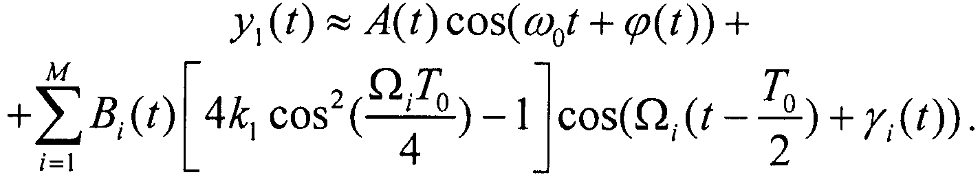 Из (10) следует, что в выходном сигнале первого звена заявленного устройства содержится неизменный входной полезный сигнал (1) и частично скомпенсированный помеховый сигнал (причем частотная составляющая этого сигнала на частоте 1 будет скомпенсирована полностью, а все остальные составляющие – лишь частично в i=4k1cos2( iT0/4)-1 раз).