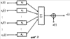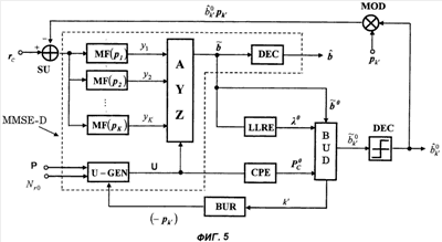 1. Декорреляционная система распознавания сигналов многостанционного доступа с кодовым разделением каналов, в которой структура базовой системы образована несколькими сотами, причем каждая из указанных сот содержит базовую станцию и К пользовательских станций, причем каждая из пользовательских станций содержит пользовательский передатчик и пользовательский приемник, осуществляющие коммуникации с базовой станцией, содержащей приемник базовой станции и передатчик базовой станции, через канал многостанционного доступа, причем указанный пользовательский приемник может передавать символы данных с расширяющей последовательностью и контрольный ответный сигнал, представляющий собой указанную расширяющую последовательность, для идентификации канала от указанного пользовательского передатчика к указанному приемнику базовой станции, а указанный приемник базовой станции содержит детектор с минимизацией среднеквадратичной ошибки для анализа вектора входящих сигналов, относящихся к множеству К пользователей, путем решения системы линейных уравнений со многими неизвестными, образованной для указанного вектора входящих сигналов и состоящей из матрицы U разделения пользователей, образованной матрицей Р контрольных ответных сигналов всех К пользователей, приписанных к указанным каналам, и матрицей мощности белого шума, умноженной на единичную матрицу, и неизвестного вектора данных, отличающаяся тем, что указанный приемник базовой станции содержит: средства для решения первой системы декорреляционных уравнений с матрицей U разделения пользователей для формирования в анализирующем контуре вектора мягких результатов, средства формирования матрицы С оценки шумов, состоящей из соответствующих К пользователям векторов оценки шумов, путем вычисления матрицы, обратной матрице U разделения пользователей, и выработки меры правильного решения, состоящей из К компонент, соответствующих мощностям указанных соответствующих К пользователям векторов оценки шумов, в элементе оценки мощности, средства для отбора одной компоненты мягкого результата из указанного вектора мягких результатов в качестве первого лучшего пользователя uk’, по минимальной компоненте указанной меры правильного решения в контуре отбора лучшего пользователя, средства для жесткого отбора в решающем контуре указанного мягкого результата для получения детектированного значения  средства для удаления компонент, соответствующих первому лучшему пользователю uk’, из первой системы декорреляционных уравнений с указанной матрицей U разделения пользователей при помощи контуров модулятора, вычитающего элемента и элемента удаления лучшего пользователя для формирования второй системы декорреляционных уравнений с матрицей U1 разделения пользователей, средства для решения указанной второй системы декорелляционных уравнений для формирования вектора мягких результатов для формирования матрицы С оценки шумов, состоящей из (К-1) векторов оценки шумов, путем вычисления матрицы, обратной матрице U1 разделения пользователей, и выработки меры правильного решения, состоящей из (К-1) компонент, соответствующих мощностям указанных соответствующих (К-1) пользователям векторов оценки шумов, в элементе оценки мощности, средства для отбора одной компоненты м
