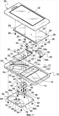 Основной корпус 10 имеет панель клавиш, состоящую из зон 12а и 12b на передней поверхности, которые открываются при перемещении выдвижного корпуса 20 вверх; поворотный направляющий паз 16 и поворотное отверстие скольжения 18 образуют верхнюю недоступную зону. Зона панели клавиш 12а содержит цифровые и буквенные клавиши (не показаны), которые стандартно размещаются на корпусе типового сотового телефона. Верхняя зона панели клавиш 12b содержит различные функциональные клавиши (например, функциональные клавиши, связанные с меню, подтверждением, вызовом, прерыванием, отменой, всплывающим меню и сообщениями), которые стандартно размещаются на выдвижном корпусе 20 типового сотового телефона. Площадь зоны дисплея 22 выдвижного корпуса 20 максимально увеличена благодаря расположению функциональных клавиш на основном корпусе 10.