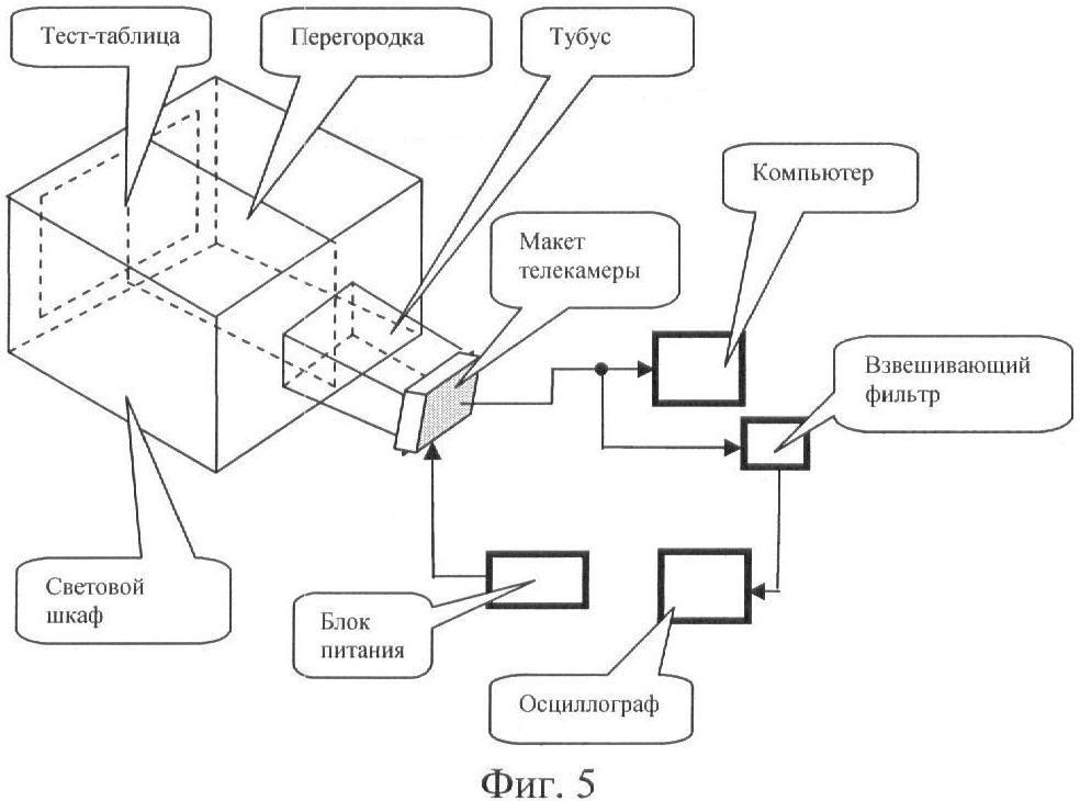 Схема организации рабочего места для проведения испытаний показана на фиг.5. В макете телевизионной камеры был использован отечественный камерный модуль VSI-746, выполненный на базе единственной матрицы ПЗС с числом элементов 582(V)×752(H) и размером мишени по диагонали 1/2 дюйма [2]. В качестве оптики в макете телевизионной камеры применен объектив «Yamano» с фокусным расстоянием 16 мм, с установленным на нем светофильтром СЗС23.
