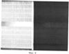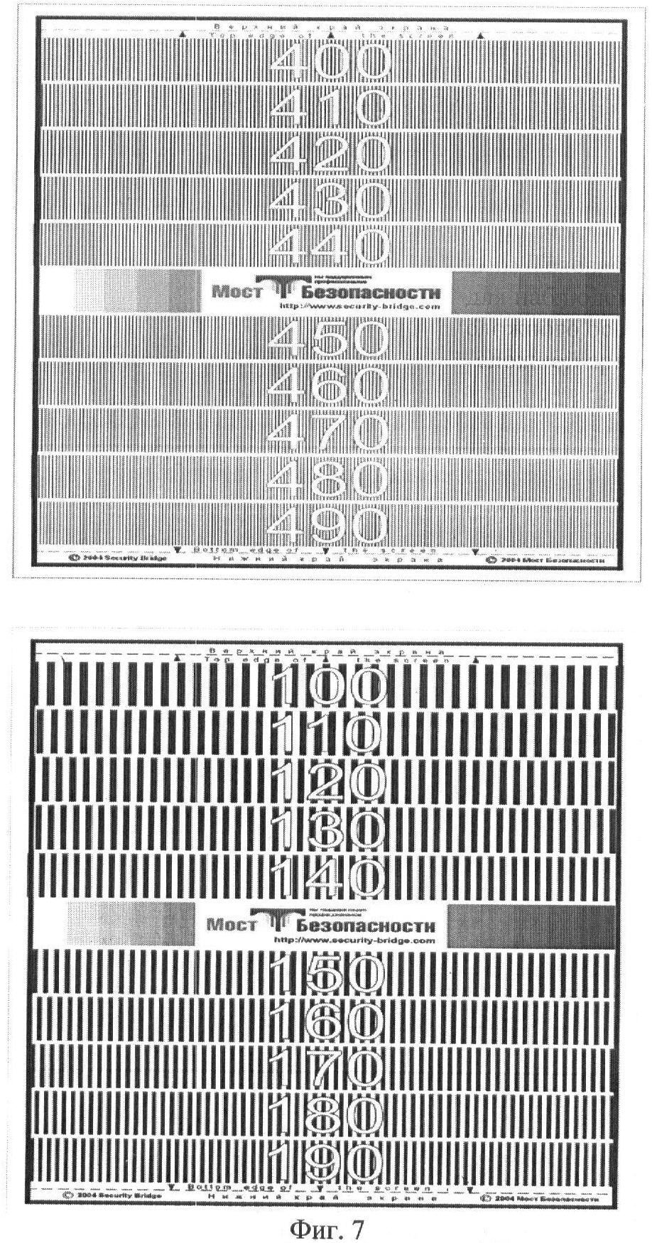 Макет телевизионной камеры устанавливался на тубус специально разработанного светового шкафа, с помощью которого наблюдаемая сцена с размерами 300(V)×420(H) мм разделялась по вертикали перегородкой в соотношении 1:1. Взаимное расположение испытательных таблиц в боксе светового шкафа (см. фиг.6) было таким, что в левой части сцены размещалась испытательная таблица «(400 490) ТВЛ», внешний вид которой представлен на фиг.7 (вверху), а в правой части – испытательная таблица «(100 190) ТВЛ», показанная на фиг.7 (внизу). При помощи двух светорегуляторов можно было создать высокую освещенность для левой половины сцены и низкую для правой ее половины.