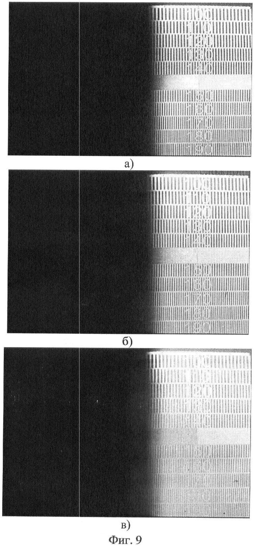 Телевизионные изображения, наблюдаемые во время измерения, с использованием программного продукта Aver TV в режиме «Снимок» записывались в компьютер. На фиг.9 приведены распечатки трех записанных изображений, которые наблюдались при значениях Emax, соответственно 580 лк (изображение – а), 1000 лк (изображение – б), 10500 лк (изображение – в). Это свидетельствует о достижении динамического диапазона (D) для заявляемого решения, равного 66,4 дБ, т.е. расширения по сравнению с прототипом на 25,1 дБ.
