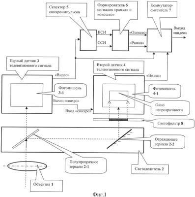 Заявляемая телевизионная камера (см. фиг.1) содержит последовательно расположенные и оптически связанные объектив 1 и светоделитель 2, первый выход которого оптически связан с фотомишенью 3-1 первого датчика 3 телевизионного сигнала, а второй выход светоделителя 2 – с фотомишенью 4-1 второго датчика 4 телевизионного сигнала, причем геометрические размеры фотомишеней 3-1 и 4-1 одинаковы, а проекции оптического кадра объектива на фотомишенях 3-1 и 4-1 совпадают, а также последовательно соединенные селектор 5 синхроимпульсов, формирователь 6 сигналов «рамка» и «окошко» и коммутатор-смеситель 7, при этом выход «синхро» первого датчика 3 подключен к входу «синхро» второго датчика 4, а выход «видео» первого датчика 3 – к входу селектора 5 синхроимпульсов и к первому информационному входу коммутатора-смесителя 7, второй информационный вход которого подключен к выходу «видео» второго датчика 4, а выход коммутатора-смесителя 7 является выходом «видео» телевизионной камеры, при этом между вторым выходом светоделителя 2 и фотомишенью 4-1 введен светофильтр 8 с переменной по полю оптической плотностью или на фотомишень 4-1 нанесена технологическая маска, причем каждый из альтернативных признаков обеспечивает для входного светового потока «окно» непрозрачности, пространственное положение которого соответствует временному размещению в растре сигнала электронной «рамки», размеры которой по горизонтали и вертикали совпадают с размерами электронного «окошка» и соответствуют в единицах времени геометрическим размерам «окна» непрозрачности.