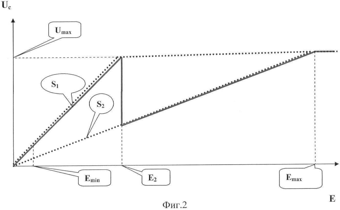 Световая характеристика телевизионной камеры будет кусочно-ломаной функцией, как показано сплошной линией на фиг.2. По сравнению с прототипом, на участке светового диапазона (Emin÷Е2) телевизионной камеры выигрыш в передаваемом динамическом диапазоне градаций яркости равен отношению крутизны «свет-сигнального» преобразования датчика 4 (S1) к крутизне «свет-сигнального» преобразования датчика 3 (S2), a следовательно, и отношению их времен накопления, т.е.: