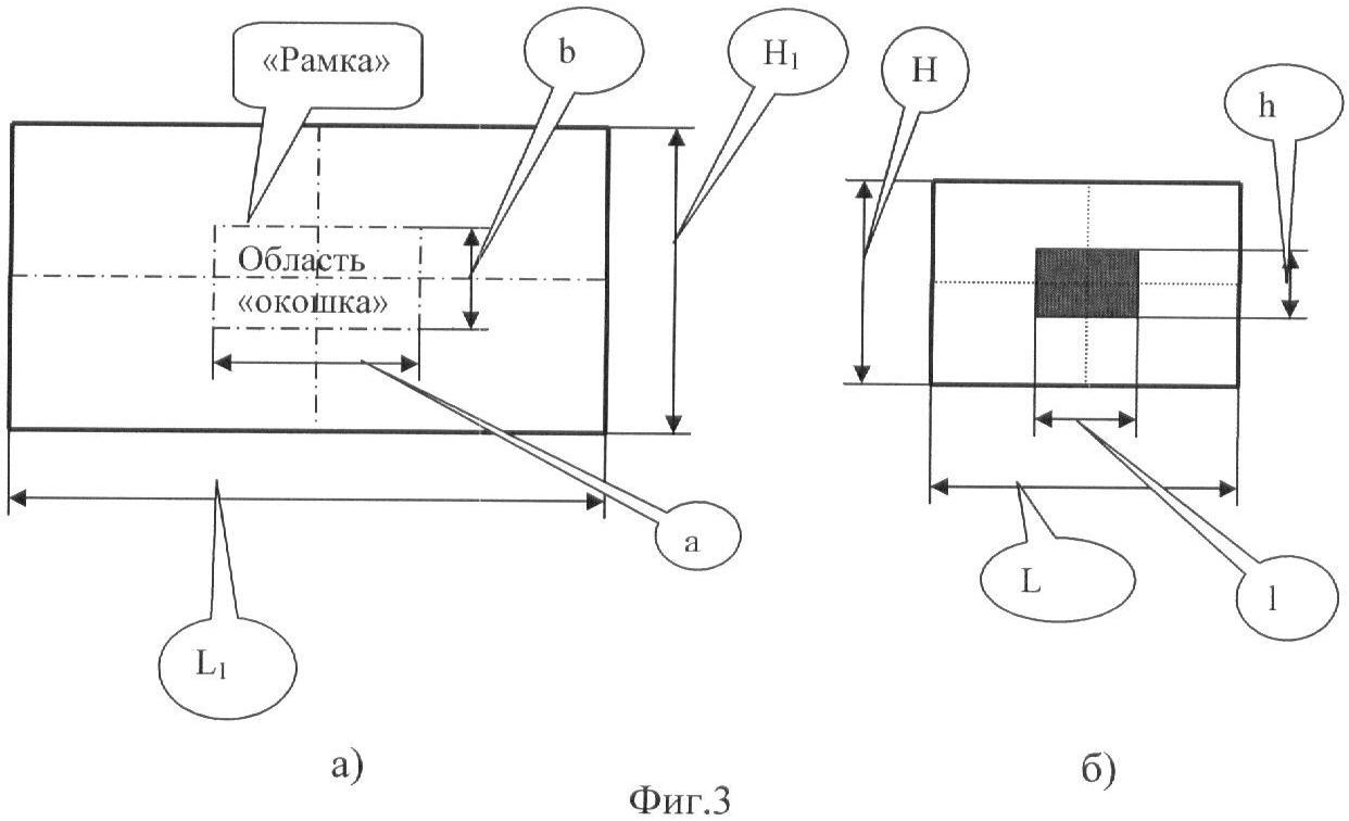 Если видимое с экрана монитора изображение имеет размеры (L1×H1), а размеры электронной «рамки» и области «окошка» составляют (a×b) в мм, как показано на фиг.3а), то имеем соотношение: .