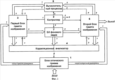 Формирователь изображения (фиг.1) работает следующим образом. Контроллер 2 задает циклограмму работы устройства. По сигналу со второго выхода (« ») контроллера 2 блок 1 оптического приема изображения формирует два изображения с противоположно направленными развертками. Данные этих изображений синхронно поступают в первый БП 3 изображения и второй БП 6 изображения соответственно. При этом переключением адресов (пикселей) первого БП 3 изображения и второго БП 6 изображения контроллер 2 управляет по своим первому и четвертому выходам соответственно, причем каждому элементу изображений выделяется память для хранения информации о яркости и цвете, а также для нижеуказанной служебной информации, используемой в процессе формирования итогового изображения с устраненными геометрическими искажениями движущихся объектов. После сохранения исходных изображений в блоках 3 и 6 они с помощью многоканального КА 4 сравниваются с соответствующими элементами фонового изображения, захваченного ранее и хранящегося в блоке 7. Переключение адресов блока 7 осуществляется сигналом с третьего выхода контроллера 2. Пиксели изображений, не совпадающие с соответствующими пикселями фонового кадра, отмечаются как принадлежащие движущемуся объекту. Одновременно происходит корреляционное сравнение данных изображений, хранящихся в блоках 3 и 6, между собой для определения нового кадра фона.