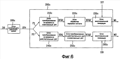 Обработанный низведенный сигнал XT6′ задерживается на величину задержки декодирования на блоке 210f обработки сигнала. Низведенный сигнал XT6′ может задерживаться на величину задержки декодирования. Низведенный сигнал XT6 задерживается потому, что схема низводящего декодирования, предполагаемая при кодировании, отличается от схемы низводящего декодирования, используемой при декодировании.