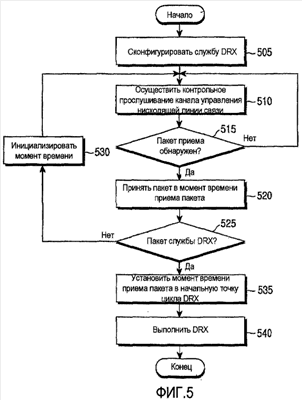 Фиг.5 показывает пример операции приема DRX согласно настоящему изобретению. Терминал принимает на этапе 505 конфигурационную информацию DRX для произвольной службы, сигнализируемую с базовой станции. Конфигурационная информация DRX включает в себя длину цикла DRX, количество пакетов, которые должны передаваться за цикл DRX, и тому подобное. Терминал осуществляет контрольное прослушивание на этапе 510 совместно используемого канала управления нисходящей линии связи до тех пор, пока не попадается пакет, переданный ему.