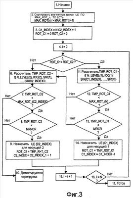 На этапе 14 объект пользователя с заданным индексом назначают несущей 1 и оценивают нагрузку по несущей 1, ROT_C1. Как можно видеть на фиг.6, эта нагрузка мала для UEN = UE 2. Кроме того, индекс выделения несущей уменьшается, C1_INDEX, по порядку, то есть процесс готов к обработке объекта пользователя, имеющего следующее более высокое значение MAX_ROT. Аналогично объекты пользователей, имеющие наивысшее допустимое значение MAX_ROT, распределяют (в порядке убывания) для не RACH несущей C2 в соответствии с этапами 7-9.
