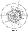 Как наилучшим образом видно на фигурах 2а, 3а, каждый из элементов 55 концентратора имеет первый обод 79, с помощью которого он устанавливается напротив оси вращения 9, и второй обод 81, который проходит под острым углом к концу первого обода 79, примыкающему к оси вращения 9. Ободы 79, 81 имеют вырезы 83 или 85, проходящие вдоль ободов, на которых смежные элементы 55 концентратора в окружном направлении перекрываются с взаимной блокировкой с первым ободом 79 и вторым ободом 81. Элементы 55 концентратора образуют, таким образом, по направлению вдоль окружности сквозное отверстие 57, размер которого может изменяться путем поворота управляющего кулачка 67 между максимально открытым диаметром (фиг.2а) и минимально открытым диаметром (фиг.3а).