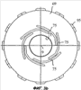 Управляющий кулачок 69 устанавливается на направляющем кольце 37, например, с помощью болтов 67 или расцепляемой муфты, при этом управляющий кулачок закрывает и фиксирует по направлению оси элементы 55 концентратора на стороне, обращенной в осевом направлении от катушечного блока 21. Управляющий кулачок имеет, как это показано на Фиг.2b и 3b, сквозное отверстие 71 для гильзы 3, концентричное с осью вращения 9 и соединенное с каждым из элементов 55 концентратора через кулачки 73 с наклонной поверхностью. При вращении управляющего кулачка 69 относительно направляющего кольца 39, кулачки 73 с наклонной поверхностью поворачивают элементы 55 концентратора вокруг осевого штифта 59 и, таким образом, изменяют радиальный выступ элементов 55 концентратора за пределы внутренней поверхности катушечного блока 21 в радиальном направлении относительно оси вращения 9. Кулачки 73 с наклонной поверхностью сформированы по существу спиралевидными пазами или прорезями 75 в управляющем кулачке 69 и кулачковыми выступами 77 на элементах 55 концентратора.
