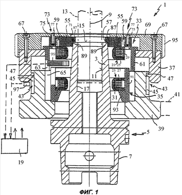 Для обеспечения возможности отделения вала 13 инструмента от инструментальной оправки 5 очень важно, чтобы гильза 3 расширялась за достаточно короткое время до тех пор и столь равномерно, чтобы размер приемного отверстия 11 во всех осевых положениях увеличивался относительно вала 13 инструмента, который тоже может несколько расшириться. Для обеспечения равномерного нагревания гильзы 3 блок 1 имеет два размещенных друг от друга на осевом расстоянии катушечных блока 21, 23, катушки 29, 31 которых, намотанные на корпуса 25, 27 катушек, кольцеобразно охватывают с наружной стороны гильзу 3 в радиальном направлении и, по существу, концентричны с осью вращения 9. Для каждого катушечного блока 21, 23 предназначен концентратор 33 или 35 магнитного потока, который зафиксирован по направлению оси относительно катушечного блока 21 или 23.