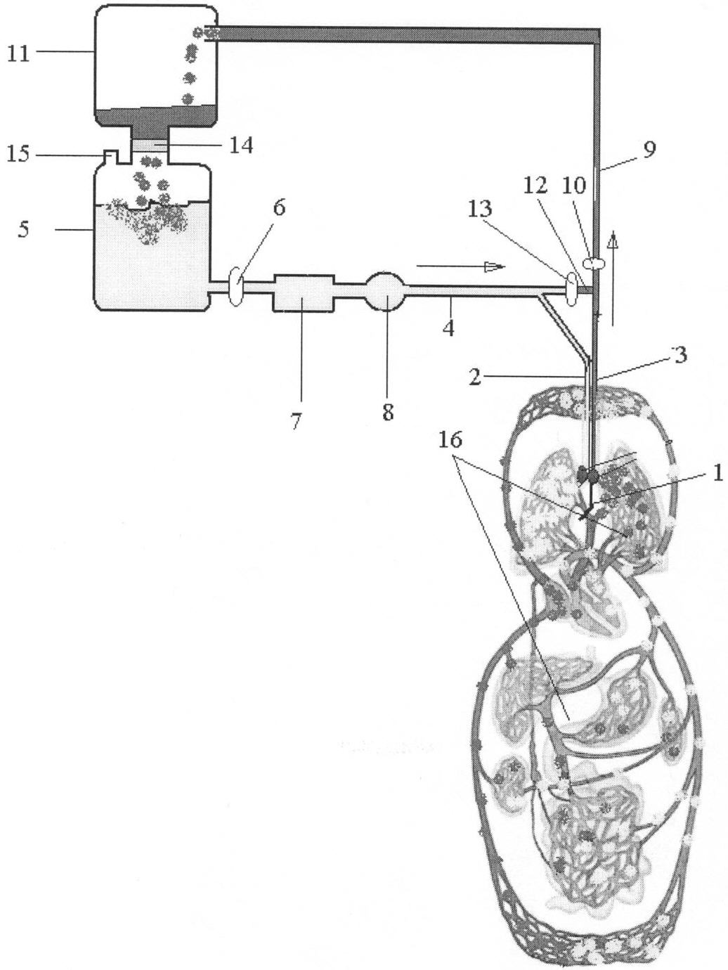 Далее систему переводят в режим «циркуляции». Для чего открывают кран 6 и закрывают кран 13, открывают кран 10. При этом консервирующий раствор поступает по трубопроводу 4 через эндотрахеальную трубку 2 в правое легкое и нагнетается в сосуды трупа, а через левое легкое, через эндотрахеальную трубку 3 отводится по трубопроводу 9 в принимающий резервуар 11. Между принимающим резервуаром 11 и подающим резервуаром 5 установлен фильтр 14, через который проходит смесь консервирующего раствора с трупной жидкостью. Фильтр служит для улавливания сгустков крови, которые могут в дальнейшем при циркуляции забивать капилляры легких и мелкие сосуды, что будет ухудшать эффективность бальзамирования. Принимающий резервуар 5 имеет отверстие с пробкой 15 для заполнения консервирующим раствором. Циркуляция консервирующего раствора прекращается, когда цвет и однородность раствора в обоих резервуарах одинаковы. При бальзамировании введение консервирующих растворов осуществляют в сосудистые системы трупа, схема кровообращения представлена на фиг.1 позиция 16. В режиме «циркуляции» гидроударная система поднимает давление до 3 атм и работает в режиме пульсации 40-100 ударов в минуту. Таким способом стенки альвеол расширяются (А.Хэм, Д.Нормак. Гистология, том 4. – М.: МИР. – 1983 г. – С.225-226), что дает возможность проникать раствору в капилляры и далее в легочные вены и легочные артерии. Движению растворов по легочной артерии препятствуют сердечные клапаны, поэтому жидкость продвигается по легочным венам в левое предсердие, левый желудочек сердца в аорту и далее во всю кровеносную систему. Также раствор попадает в сосуды лимфатической системы и распространяется по ней. Далее консервант, проходя по артериям большого круга сосудистой системы, вытесняет трупную жидкость в малый круг по легочной артерии в левое легкое (правая ветвь легочной артерии закрыта зажимом – 1), откуда по эндотрахеальной трубке – 3 и трубопроводу 9 попадает в принимающий резервуар – 11, из которого через фильтр – 14 попадает в подающий резервуар 5, где трупная жидкость смешивается с консервирующим раствором и вновь подается в сосудистую систему. Отрицательное давление в герметично закрытых резервуарах – 5 и 11 возникает из-за ухода жидкости в сосудистую систему трупа посредством насоса 7.